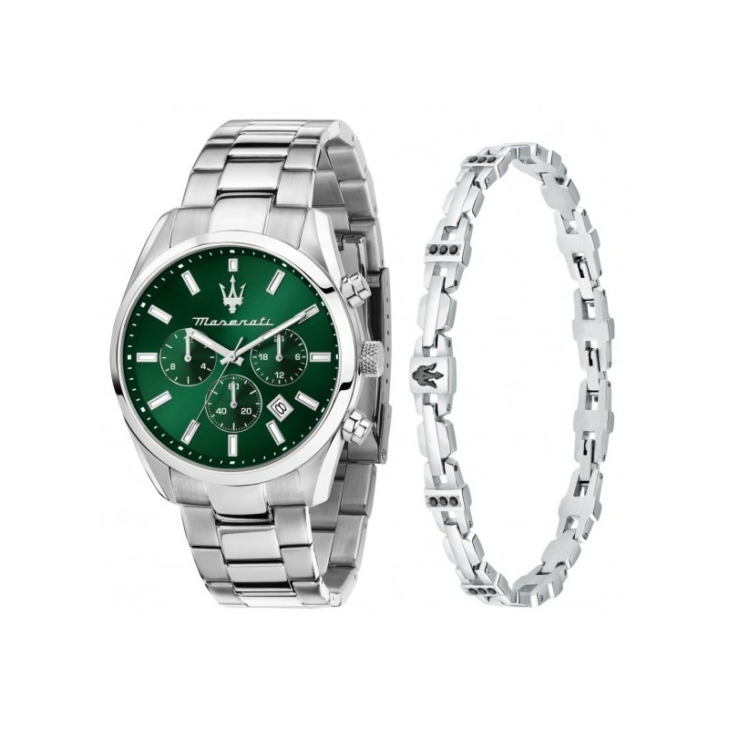 Montre-bracelet pour homme Maserati de la collection Attrazione, dotée d'un mouvement à quartz VD33 et de fonctions chronographe avec date. Boîtier rond en acier inoxydable argenté de 43 mm de diamètre et 10,50 mm d'épaisseur, avec fond clipsé en acier. Cadran analogique vert avec index bâtons, logo à 12 heures et guichet de date entre 4 et 5 heures, verre minéral. Bracelet en acier inoxydable argenté avec boucle déployante à bouton-poussoir, étanche à 5 ATM : résistant aux éclaboussures mais non étanche à la pression. Le coffret spécial comprend un bracelet en acier inoxydable orné d'un logo noir central et de pierres de zircone noire.