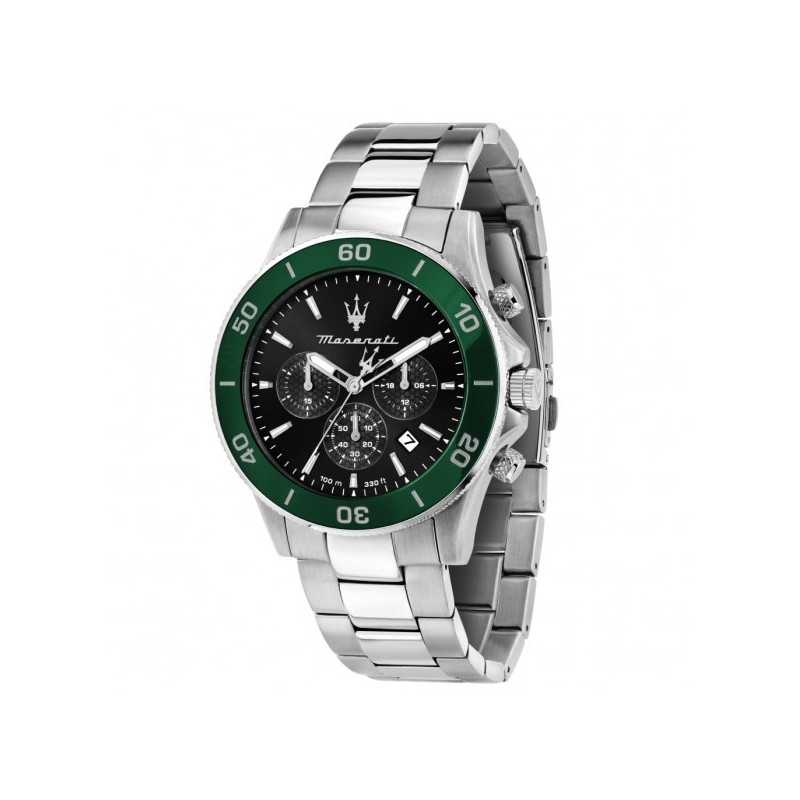Montre-bracelet pour homme Maserati de la collection Competizione, dotée d'un mouvement à quartz Miyota JS25 et de fonctions chronographe avec date. Boîtier rond en acier inoxydable argenté de 43 mm de diamètre et 11,20 mm d'épaisseur, lunette en céramique verte avec minuterie, fond et couronne vissés en acier. Cadran analogique noir avec index bâtons, logo à 12 heures et guichet de date entre 4 et 5 heures, verre minéral. Bracelet en acier inoxydable argenté avec boucle déployante à bouton-poussoir, étanche à 10 ATM.