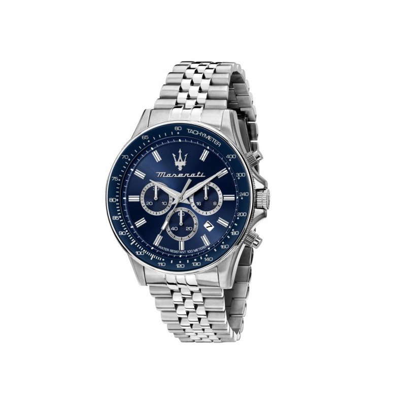 Montre-bracelet pour homme Maserati de la collection Sfida, dotée d'un mouvement à quartz Miyota JS25 et d'une fonction chronographe avec date. Boîtier rond en acier inoxydable argenté de 44 mm de diamètre et 11,40 mm d'épaisseur. Lunette en acier avec finition tachymétrique bleue. Fond et couronne vissés pour une étanchéité renforcée.
