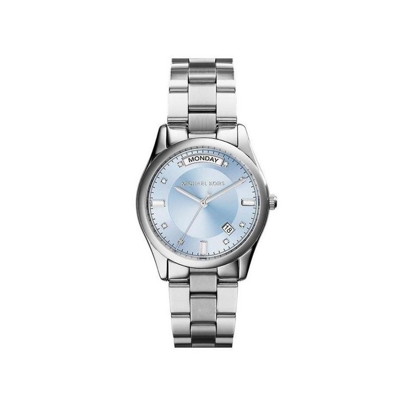 Élégantes montres-bracelets analogiques pour femme Michael Kors Colette MK6068 avec mouvement à quartz à piles de type japonais, boîtier en acier inoxydable argenté de 34 mm de diamètre, cadran bleu circulaire analogique avec présence de cristal et fonction date, verre minéral, bracelet en acier inoxydable argenté avec fermeture dissimulée, résistant à l'eau 3 ATM