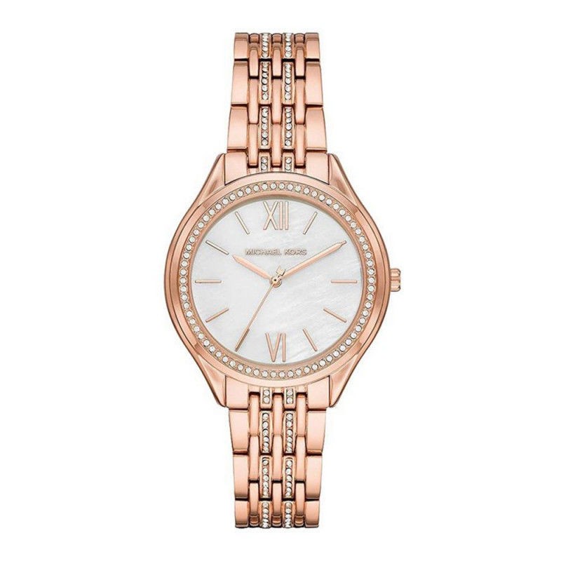 Montre-bracelet mode Michael Kors Mindy MK7076 femme analogique avec mouvement à quartz alimenté par une pile de type japonais, boîtier en acier inoxydable d'un diamètre de 36 mm de couleur or rose avec monture en cristal, cadran circulaire en nacre avec index mixtes et temps de fonction solo, bracelet en verre minéral et acier inoxydable de couleur or rose orné de cristaux avec fermeture dissimulée avec boutons latéraux, résistant à l'eau 3 ATM