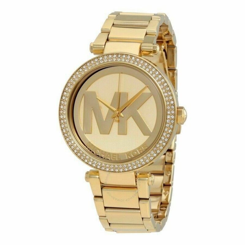 Montre heure seulement pour femme Michael Kors avec boîtier et bracelet en acier doré, cadran doré avec logo Michael Kors. L'éclat des cristaux sertis sur la lunette avec cadran doré avec logo. Diamètre du boîtier 39 mm Épaisseur du boîtier 12 mm Cadran analogique Verre minéral Or Bracelet en acier inoxydable Résistance à l'eau 5 atm