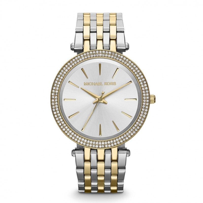 Montre-bracelet Michael Kors pour femme de la collection Automne avec mouvement à quartz et fonction heure seule. Boîtier en acier inoxydable couleur argent de 39 mm de diamètre, lunette en acier couleur or ornée d'une double rangée de cristaux blancs, cadran analogique couleur argent avec index bâtons couleur or, logo sur le dessus, verre minéral. Bracelet en acier inoxydable bicolore argent et or avec boucle déployante, étanche 5 ATM : résiste aux éclaboussures d'eau mais pas à la pression.