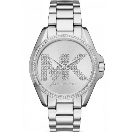 Montre-bracelet Michael Kors pour femme de la collection Bradshaw avec mouvement à quartz et fonction heure seule. Boîtier en acier inoxydable couleur argent d'un diamètre de 38 mm et d'une épaisseur de 8 mm, lunette en acier couleur argent agrémentée de cristaux blancs, cadran analogique couleur argent sans index avec logo central agrémenté de cristaux blancs, verre minéral. Bracelet en acier inoxydable argenté avec boucle déployante à bouton-poussoir, étanche à 5 ATM : résistant aux éclaboussures d'eau mais pas sous pression.