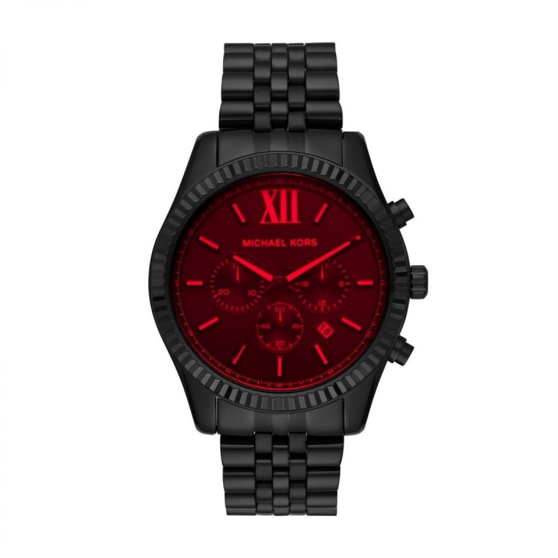 Montre-bracelet pour homme Michael Kors de la collection Lexington, à mouvement quartz et fonction chronographe avec date. Boîtier en acier inoxydable noir IP, 45 mm de diamètre et 12 mm d'épaisseur, cadran analogique noir avec compteurs heures, minutes et secondes, index bâtons et chiffre romain à 12 heures uniquement, logo sur le dessus, verre minéral. Bracelet en acier inoxydable noir IP avec boucle déployante à bouton-poussoir, étanchéité 5 ATM : résistante aux éclaboussures mais non étanche à la pression.