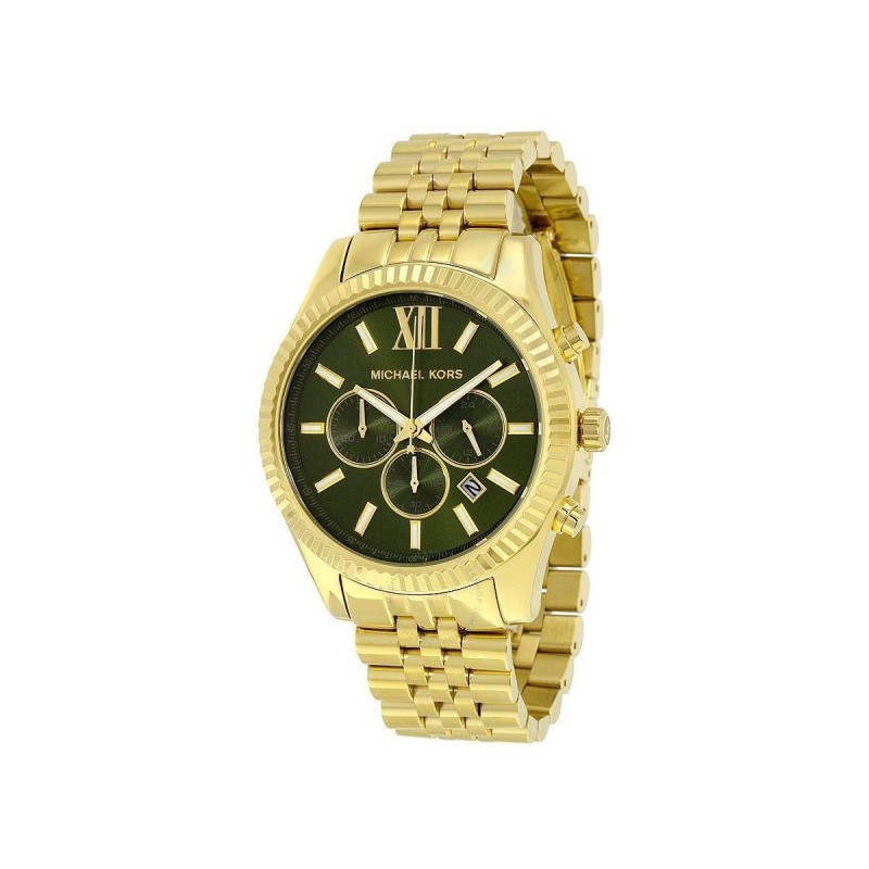 Montre-bracelet pour homme Michael Kors de la collection Lexington, à mouvement quartz et fonction chronographe avec date. Boîtier rond en acier inoxydable avec traitement IP or, diamètre 44 mm, lunette moletée en acier doré. Cadran analogique vert avec index bâtons et chiffre romain à 12 heures, affichage de la date entre 4 et 5 heures, logo en haut, verre minéral. Bracelet en acier inoxydable avec traitement IP or, boucle déployante et boutons latéraux, étanchéité 5 ATM : résistante aux éclaboussures mais non étanche à la pression.