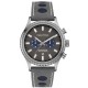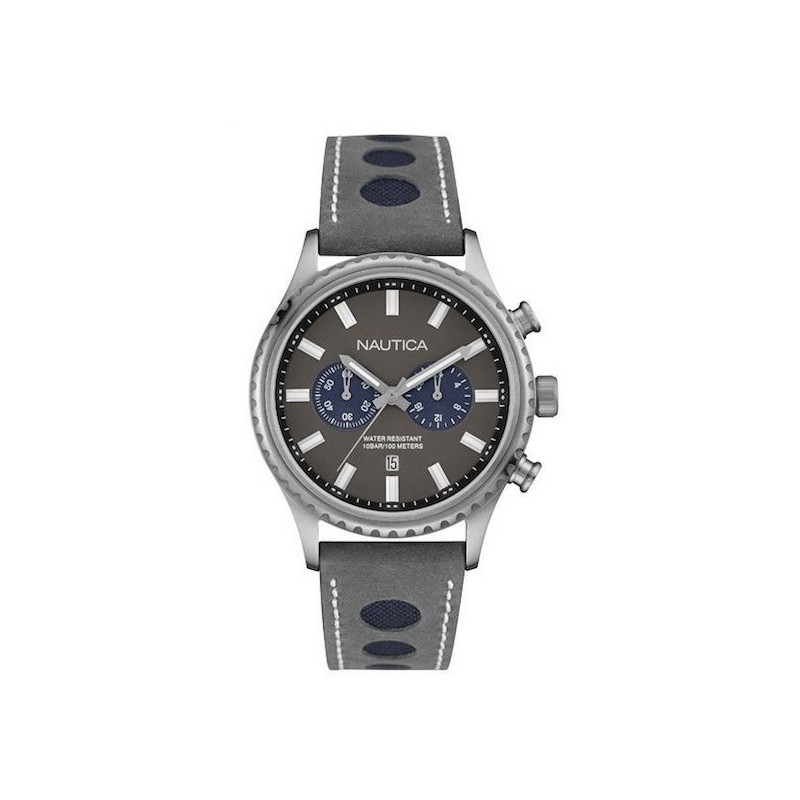 Montre nautique pour homme - Mouvement : Chrono avec date - Fond : Vis - Diamètre : 43 mm - Boîtier : Acier - Lunette : Acier moleté - Couronne : Vis - Acier - Cadran : Gris foncé avec volants bleus - Verre : Optique Minéral - Bracelet : Gris cuir avec finition cercle en tissu bleu - Fermeture: Pin - Acier - Résistant à l'eau: 100 mt.