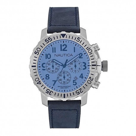 Montre-bracelet pour homme Nautica NAI19534G - Genre : Femme - Style : Décontracté - Diamètre du boîtier : 48 mm - Forme du cadran : Rond - Couleur cadran : Bleu - Type de verre : Minéral - Type de calendrier : Date - Type de mouvement : Quartz - Type d'affichage : Chronographe - Eau résistance : 100 mt - Matière du bracelet : Cuir de veau - Couleur du bracelet : Bleu