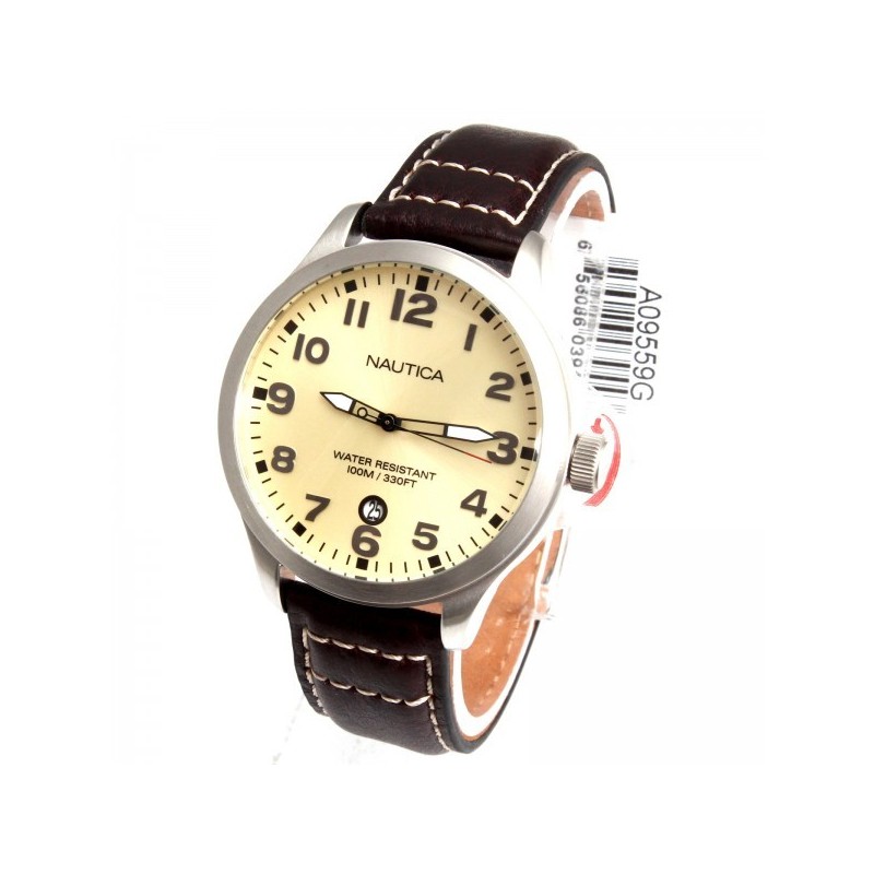 Montre analogique Nautica BFD-101. Boitier en acier brossé, diamètre 44mm, épaisseur 10mm. Cadran champagne avec détails gris, guichet date à 6h.Bracelet en cuir marron avec surpiqûres blanches contrastées. Fond et couronne vissés. Résistant à l'eau