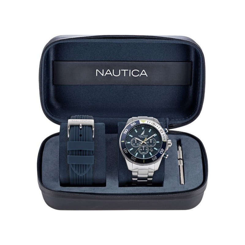 Montre-bracelet Nautica pour homme, collection One Chono, coffret inclus, mouvement à quartz et fonction chronographe avec date. Boîtier rond en acier inoxydable argenté de 48 mm de diamètre. Lunette en acier émaillé bleu et argent avec minuterie, fond et couronne vissés. Cadran analogique bleu avec index luminescents, affichage de la date entre 4 h et 16 h, logo en haut, verre minéral. Bracelet en acier inoxydable argenté avec boucle déployante à bouton-poussoir, interchangeable avec le bracelet en silicone bleu à boucle ardillon fourni dans le coffret, étanche à 10 ATM.