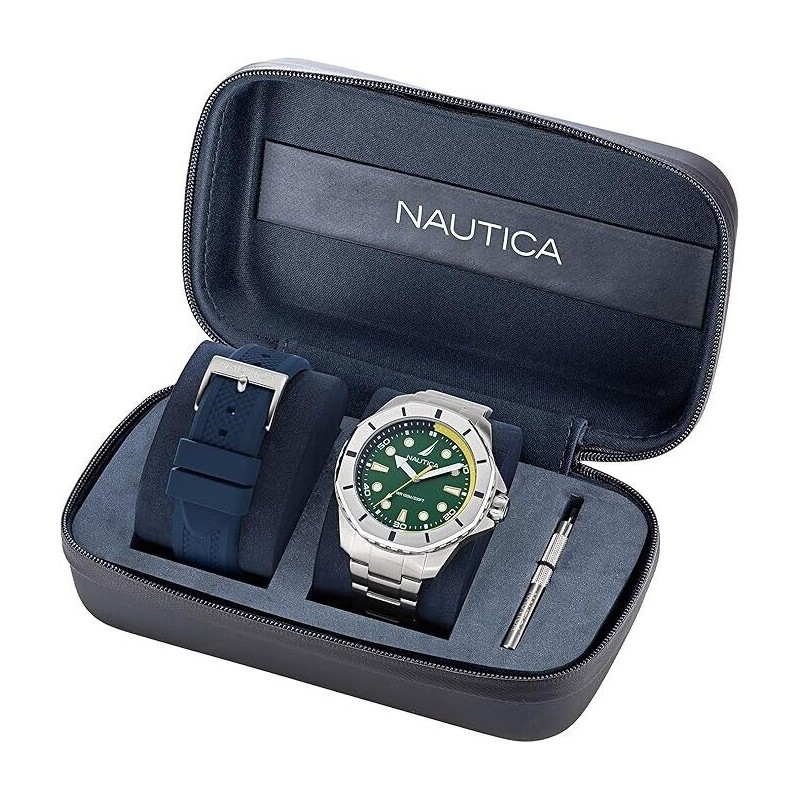 Montre-bracelet Nautica pour homme, collection Koh May Bay, coffret inclus, mouvement à quartz, affichage de l'heure uniquement. Boîtier rond en acier inoxydable argenté de 46 mm de diamètre. Lunette en acier argenté, fond et couronne vissés. Cadran analogique vert avec index géométriques, logo en haut, verre minéral. Bracelet en acier inoxydable argenté avec boucle déployante à bouton-poussoir, interchangeable avec un bracelet en silicone bleu à boucle ardillon, étanche à 10 ATM.