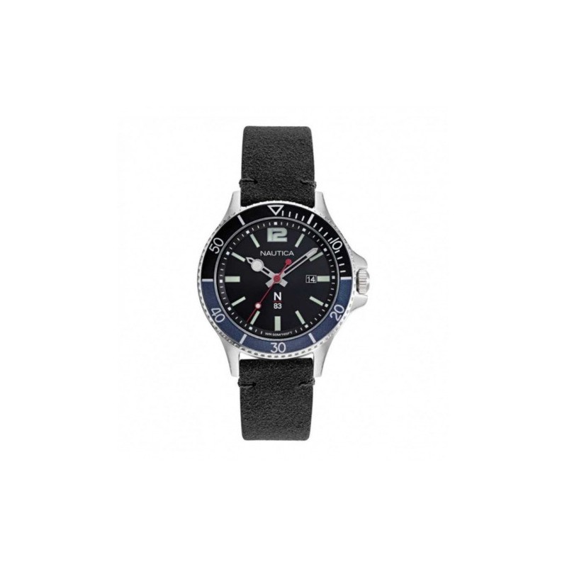 Montre-bracelet Nautica pour homme, collection N83 Accra Beach, à mouvement quartz, affichage de l'heure et de la date. Boîtier rond en acier inoxydable argenté de 44 mm de diamètre, lunette en acier bleu et noir avec minuterie, fond et couronne vissés. Cadran analogique noir avec index bâtons luminescents, chiffre arabe à 12 heures, guichet de date à 3 heures, logo en haut, verre minéral. Bracelet en cuir noir avec boucle ardillon. Étanchéité 5 ATM : résistante aux éclaboussures, mais non étanche à la pression.
