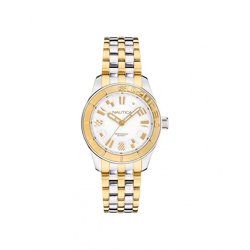 Montre-bracelet Nautica pour femme, collection Pacific Beach Lady, à mouvement quartz et affichage de l'heure uniquement. Boîtier rond en acier inoxydable argenté de 36 mm de diamètre, lunette en acier doré. Cadran analogique blanc avec index dorés en forme de drapeau, logo en haut, verre minéral. Bracelet bicolore en acier inoxydable argenté et doré avec boucle déployante à bouton-poussoir. Étanchéité 5 ATM : résistante aux éclaboussures, mais non étanche à la pression.