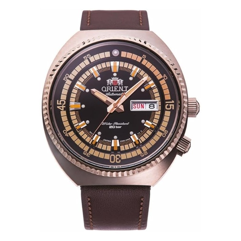 Montre de plongée Orient pour homme, à mouvement automatique, affichant l'heure, le jour, la date et le mois. Boîtier rond en acier inoxydable doré rose, 44 mm de diamètre et 13,90 mm d'épaisseur, fond et couronne vissés, lunette moletée bidirectionnelle en acier doré rose. Cadran analogique noir avec index bâtons et touches orange, guichet de date à 3 heures avec affichage du jour et du mois, logo en haut, verre minéral trempé. Bracelet en cuir de veau marron avec boucle ardillon, étanche à 20 ATM.
