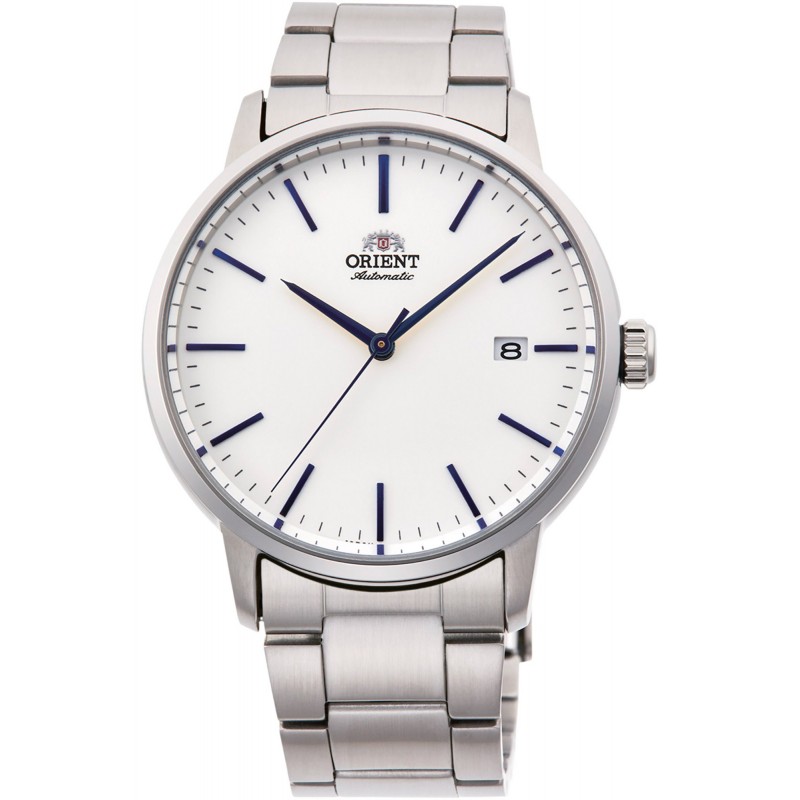 Montre-bracelet Orient pour homme, à mouvement automatique, avec affichage de l'heure et de la date. Boîtier rond en acier inoxydable argenté de 40 mm de diamètre et 12 mm d'épaisseur, fond vissé en verre, lunette fixe en acier argenté. Cadran analogique blanc avec index bâtons bleus, guichet de date à 3 heures, logo en haut, verre minéral trempé. Bracelet en acier inoxydable argenté avec boucle déployante, étanche à 10 ATM.