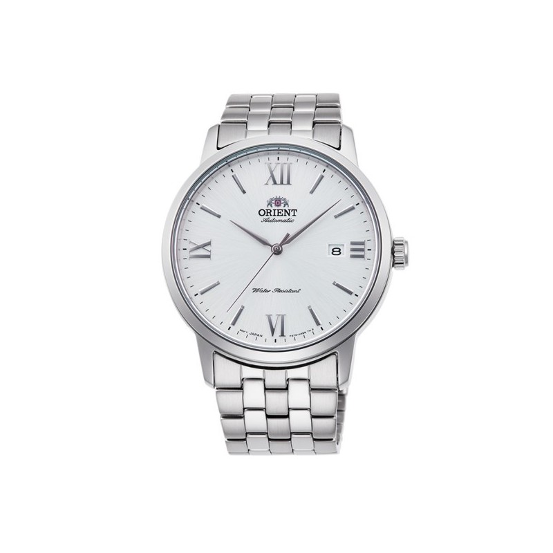 Montre-bracelet Orient pour homme, à mouvement automatique, avec affichage de l'heure et de la date. Boîtier rond en acier inoxydable argenté de 41 mm de diamètre et 12 mm d'épaisseur, fond transparent vissé, lunette fixe en acier argenté. Cadran analogique blanc avec index bâtons et chiffres romains, guichet de date à 3 heures, logo en haut, verre saphir antireflet. Bracelet en acier inoxydable argenté avec boucle déployante. Étanchéité 5 ATM : résistante aux éclaboussures, mais non étanche à la pression.