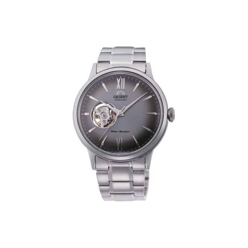 Montre-bracelet enfant Orient à mouvement automatique avec affichage de l'heure uniquement. Boîtier rond en acier inoxydable argenté, 41 mm de diamètre et 12 mm d'épaisseur, lunette fixe, fond clipsé. Cadran analogique gris avec index bâtons et chiffres romains à 12 h et 6 h, mouvement apparent sur le côté gauche, logo sur le dessus, verre minéral. Bracelet en acier inoxydable argenté avec boucle déployante à bouton-poussoir, étanchéité 3 ATM : résistante aux éclaboussures mais non étanche à la pression.
