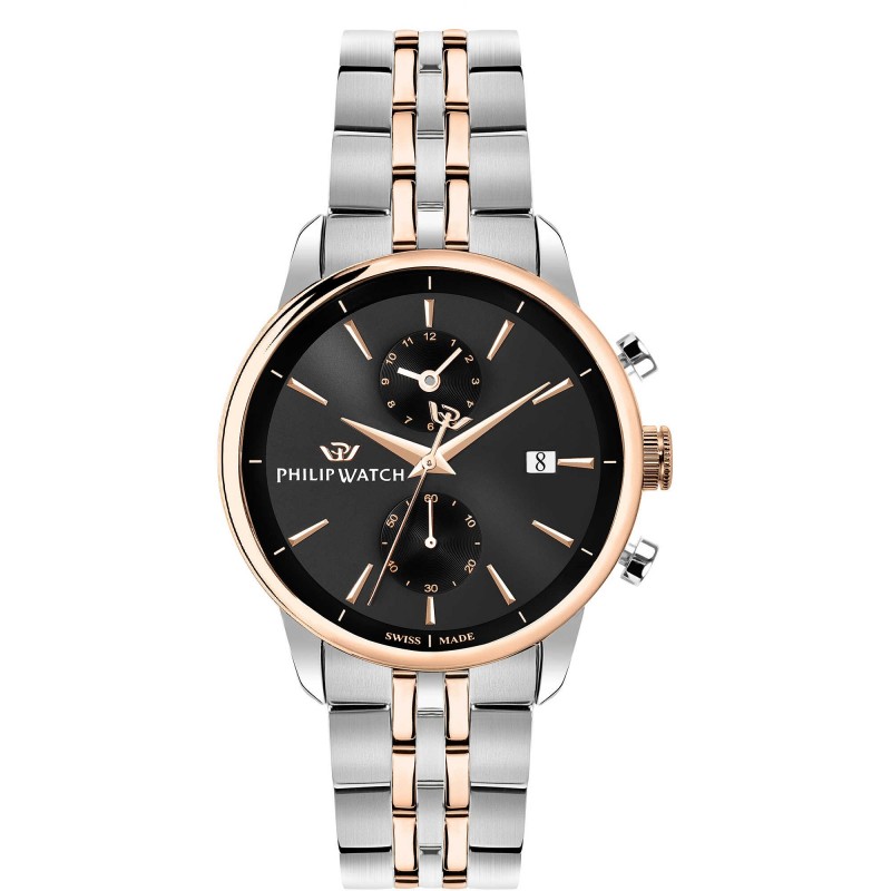 Montre chronographe pour homme Philip Watch de la collection anniversaire. Modèle en acier, or Pvd. Boîtier avec finition PVD or rose et diamètre 47X40 mm et cadran noir et verre minéral. Le bracelet est en acier couleur argent et or rose avec boucle papillon. Horloge avec mouvement Mvt.Ronda 3520.DE Résistance à l'eau de 10 Atm
