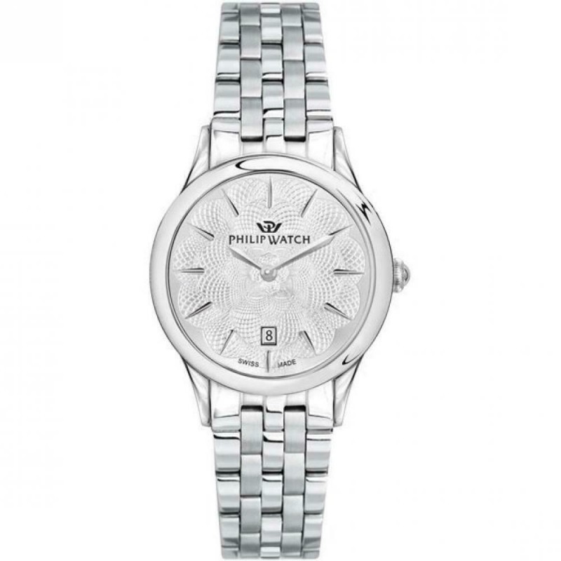 ShippingMontre Philip Watch pour femmes Only Time de la collection Marilyn. Horloge avec boîtier en acier de la taille de 39X31 mm et de l'épaisseur de 7,4 mm. Modèle avec cadran couleur argent guilloché et verre minéral.