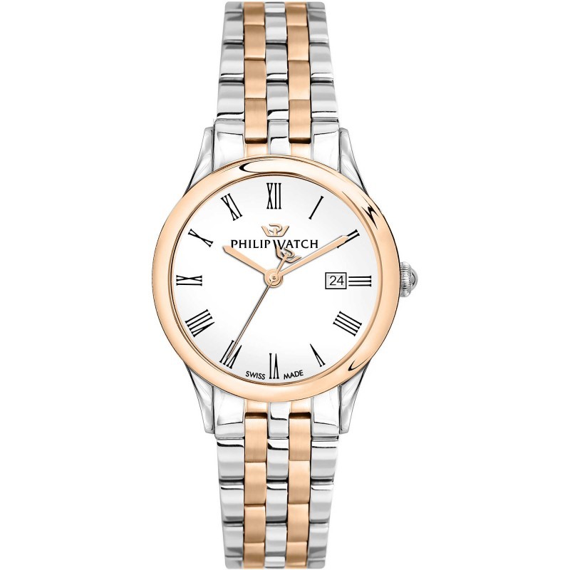 Montre automatique Philip Watch pour femme de la collection Marilyn. Montre Avec Boîtier En Acier Et Pvd Or Rose, Cadran Blanc Brillant Et Bracelet En Acier En Acier Et Or Rose Avec Papillon Avec Boutons. Boitier De Mesure 39X31Mm Et Largeur De Bracelet 16/14 Mm. Verre saphir. Mouvement Mvt. Ronda 585 3H Date H3 Aig.1