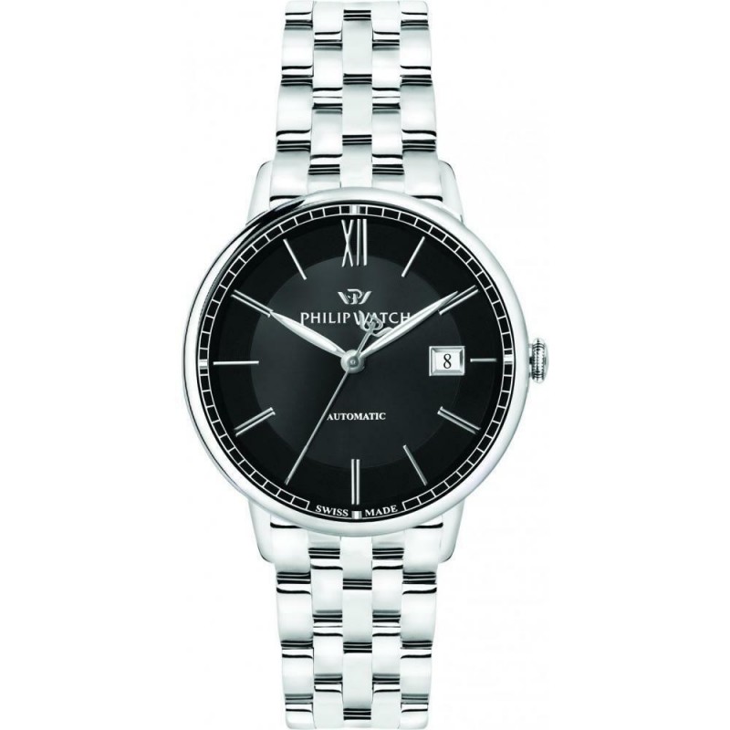 Montre automatique Philip Watch pour hommes de la collection Truman. Modèle avec boîtier en acier de la taille de 49X41Mm, cadran noir et verre saphir. Le bracelet est en métal couleur acier avec papillon à boutons. Horloge avec Mvt Eta 2824 Aig 2 Date H3 et résistance à l'eau 5 Atm