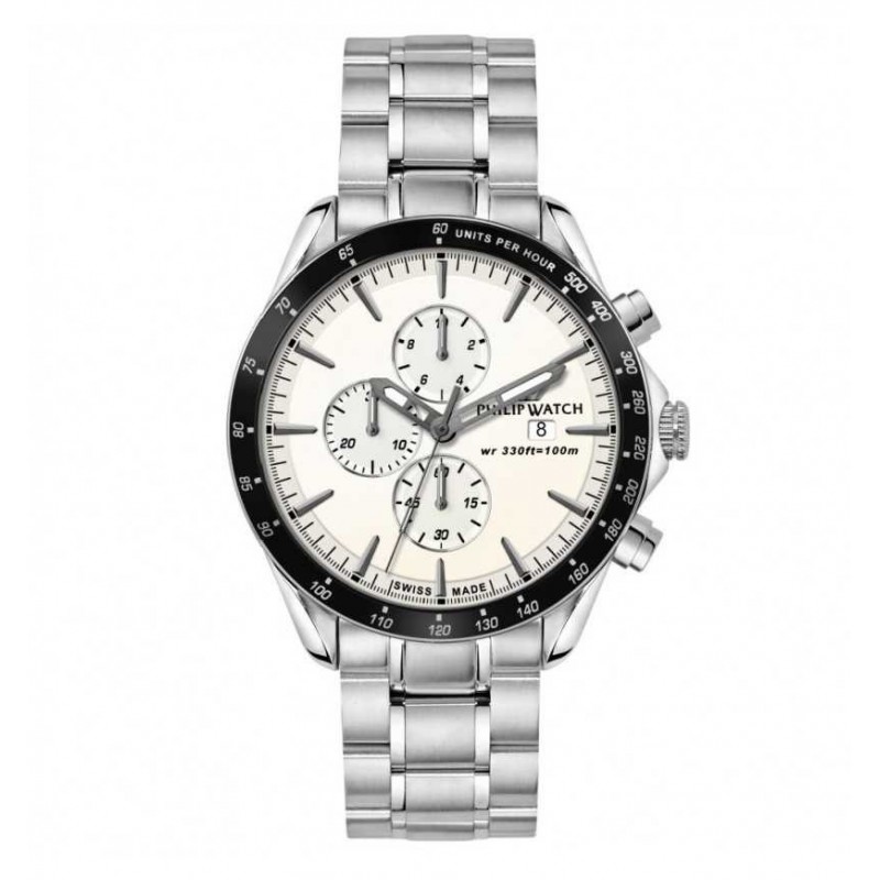 Montre chronographe pour homme Philip Watch. Montre en acier. Boîtier avec finition polie et satinée de 44 mm de diamètre avec verre saphir antireflet. Mouvement Ronda Type 3540. Bracelet en métal de couleur argent avec fermeture papillon avec boutons. La résistance à l'eau est de 10 Atm.