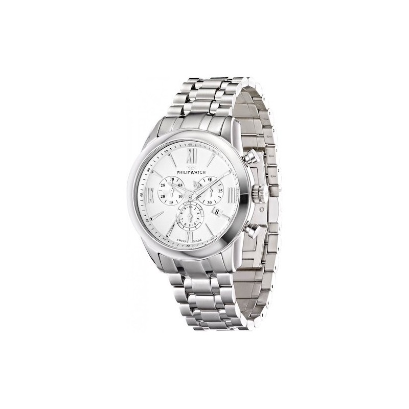 Montre pour homme Philip Watch de la collection 'Seahorse' avec bracelet en acier, boîtier en acier de 43 mm, cadran blanc avec chronographe et date. Mouvement à quartz de fabrication suisse. Cristal de saphir. Résistant à l'eau 10 ATM