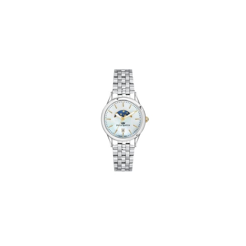 Montre PHILIP WATCH MARILYN - R8253596506 - Genre : Femme, Matériau et finition du boîtier : Acier, Taille du boîtier : 39 x 31 mm, Taille du boîtier : 39 x 31 mm, Épaisseur du boîtier : 7,4, en acier inoxydable argenté, Couleur du cadran : Nacre avec index dorés, type affichage : phase de lune et date avec lunette fixe, Verre : Verre minéral, Matière du bracelet : Acier, Métal, Couleur du bracelet : argent, Matière : Acier, Fermoir : Boucle ardillon, Mouvement : Quartz, certifié swiss made, étanche : 5 atm, Boucle : boucle ardillon