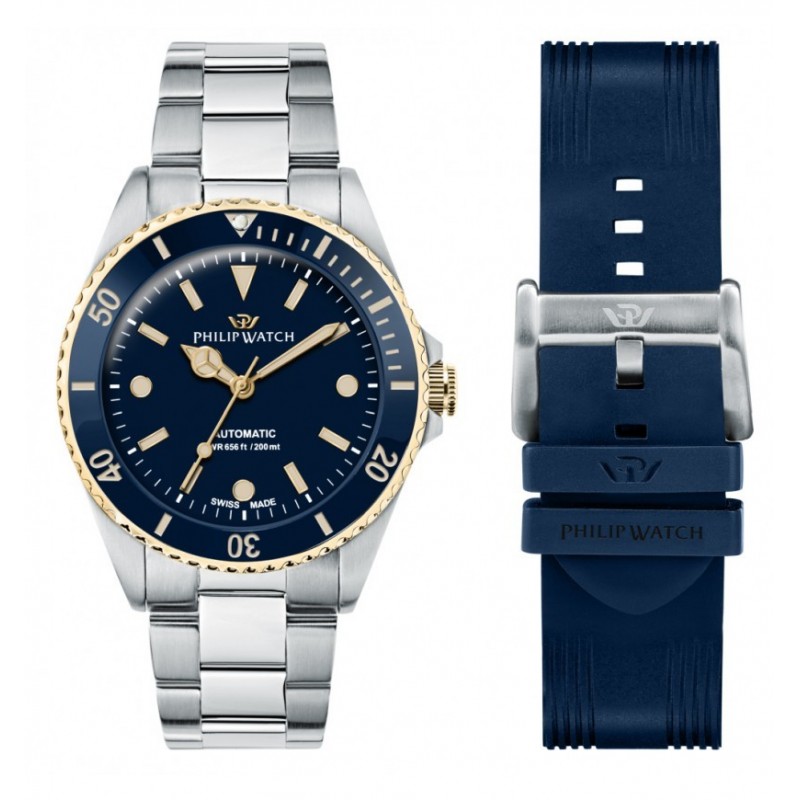 Montre-bracelet pour homme Philip Watch de la collection Caribe Diving avec mouvement automatique suisse Sellitta sw200 -01 et fonctions horaires uniquement. Boîtier en acier inoxydable argenté de 42 mm de diamètre, lunette tournante dorée avec insert en céramique bleue, fond et couronne vissés, cadran analogique bleu avec index bâtons, verre saphir bombé. Bracelet en acier inoxydable argenté avec boucle déployante à bouton-poussoir, deuxième bracelet avec extension de combinaison en silicone bleu, étanche à 20 ATM (200 mètres).