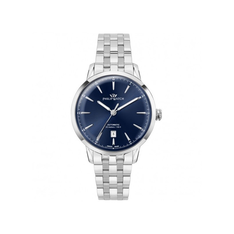 Montre homme Philip Watch de la collection Sunray Classic, dotée d'un mouvement automatique Sellita SW200-1 et affichant l'heure et la date. Boîtier en acier inoxydable poli argenté de 41 mm de diamètre et 13,25 mm d'épaisseur, cadran analogique bleu avec index bâtons, guichet de date à 6 heures et logo en haut, verre minéral doublement bombé. Bracelet en acier inoxydable argenté avec boucle déployante à bouton-poussoir. Étanchéité 5 ATM : résistante aux éclaboussures, mais non étanche à la pression.