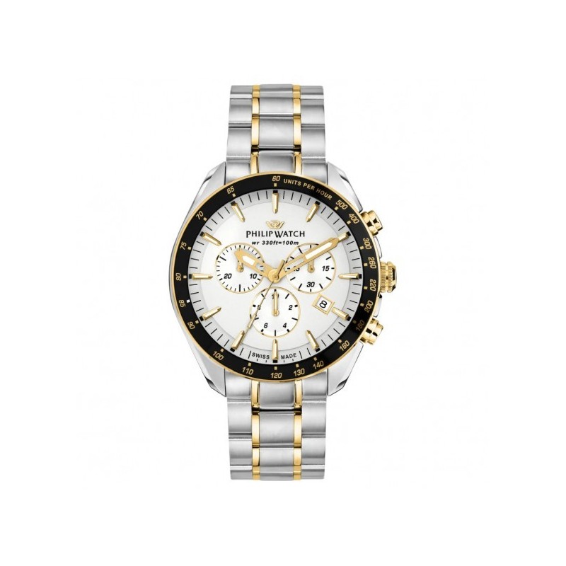 Montre homme Philip Watch de la collection Blaze Sport, dotée d'un mouvement à quartz RONDA 5040D et de fonctions chronographe avec date. Boîtier rond en acier inoxydable argenté avec détails dorés, 42 mm de diamètre et 10,80 mm d'épaisseur. Lunette dorée avec revêtement IP noir. Fond et couronne vissés pour une étanchéité renforcée.