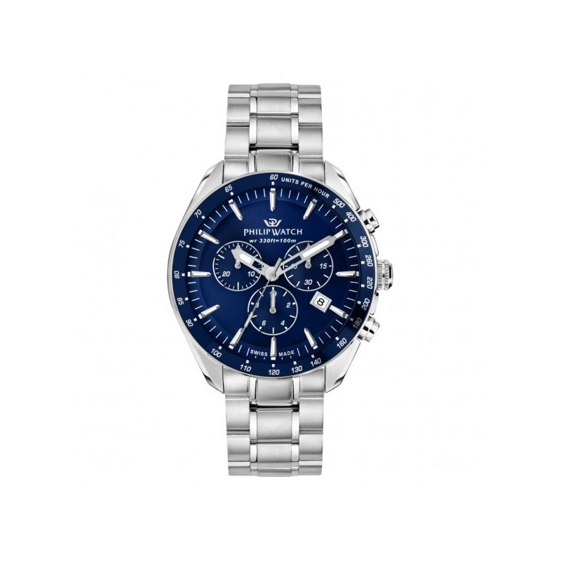 Montre-bracelet pour homme Philip Watch de la collection Blaze Sport, dotée d'un mouvement à quartz RONDA 5040D et de fonctions chronographe avec date. Boîtier rond en acier inoxydable argenté de 42 mm de diamètre et 10,80 mm d'épaisseur. Lunette avec traitement IP bleu. Fond et couronne vissés pour une étanchéité renforcée.