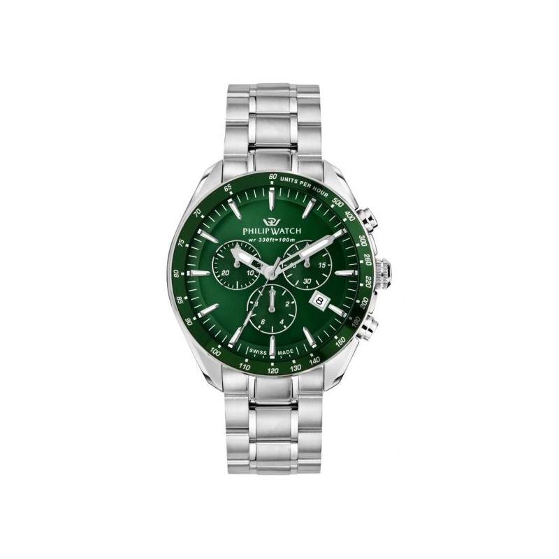 Montre-bracelet pour homme Philip Watch de la collection Blaze Sport, dotée d'un mouvement à quartz RONDA 5040D et de fonctions chronographe avec date. Boîtier rond en acier inoxydable argenté de 42 mm de diamètre et 10,80 mm d'épaisseur. Lunette avec traitement IP vert. Fond et couronne vissés pour une étanchéité renforcée.