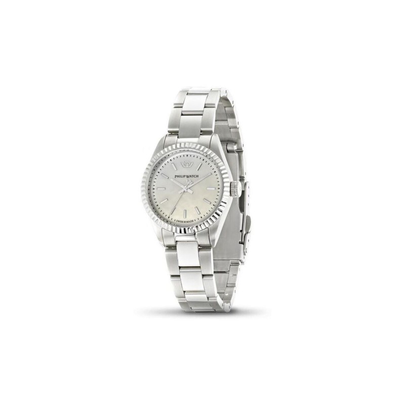 Montre-bracelet femme Philip Watch de la collection Caribe, dotée d'un mouvement à quartz Ronda 503 et de l'affichage de l'heure uniquement. Boîtier rond en acier inoxydable argenté de 31 mm de diamètre et 9 mm d'épaisseur. Lunette moletée en acier argenté, fond et couronne vissés. Cadran analogique en nacre avec index bâtons argentés, logo sur le côté, verre saphir. Bracelet en acier inoxydable argenté poli et satiné avec boucle déployante à bouton-poussoir et fermoir de sécurité, étanche à 10 ATM.