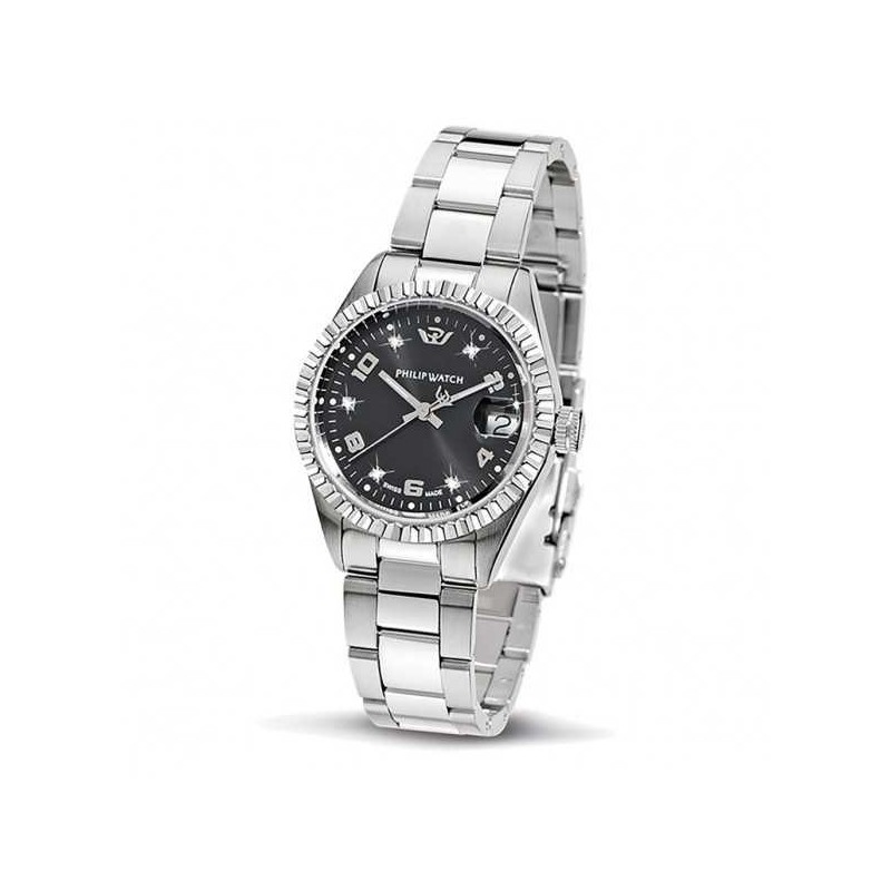 Montre-bracelet pour femme Philip Watch de la collection Caribe, à mouvement quartz RONDA 705 et fonctions heure et date. Boîtier rond en acier inoxydable argenté, 31 mm de diamètre et 9,15 mm d'épaisseur, lunette moletée en acier argenté. Cadran analogique noir avec chiffres arabes et index diamants, guichet de date à 3 heures avec loupe, logo sur le dessus, verre saphir. Bracelet en acier inoxydable argenté avec boucle déployante à bouton-poussoir et fermoir de sécurité, étanche à 10 ATM.