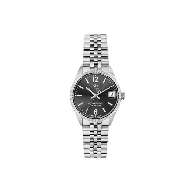 Montre-bracelet femme Philip Watch de la collection Caribe, à mouvement quartz, affichant l'heure et la date. Boîtier rond en acier inoxydable argenté de 31 mm de diamètre, fond et couronne vissés, lunette moletée en acier argenté. Cadran analogique gris/noir avec index bâtons et chiffres arabes à 12 h et 6 h, guichet de date à 3 h avec loupe, logo en haut, et verre saphir inrayable et antireflet. Bracelet Jubilee en maille milanaise en acier inoxydable argenté, finition polie et satinée, boucle déployante à bouton-poussoir avec fermoir de sécurité, étanche à 10 ATM.