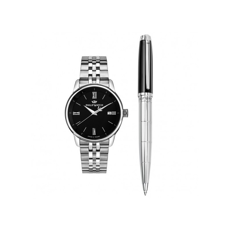 Montre-bracelet pour homme Philip Watch de la collection Anniversaire, dotée d'un mouvement à quartz ETA F06.115 et affichant l'heure et la date. Boîtier rond en acier inoxydable argenté de 40 mm de diamètre et 9,15 mm d'épaisseur. Cadran analogique noir avec index bâtons et chiffres romains à 12, 3, 6 et 9 heures, guichet de date à 3 heures, logo en haut, verre minéral. Bracelet en acier inoxydable argenté avec boucle déployante à bouton-poussoir, étanche à 10 ATM. Un stylo bille en émail noir est inclus dans le coffret.