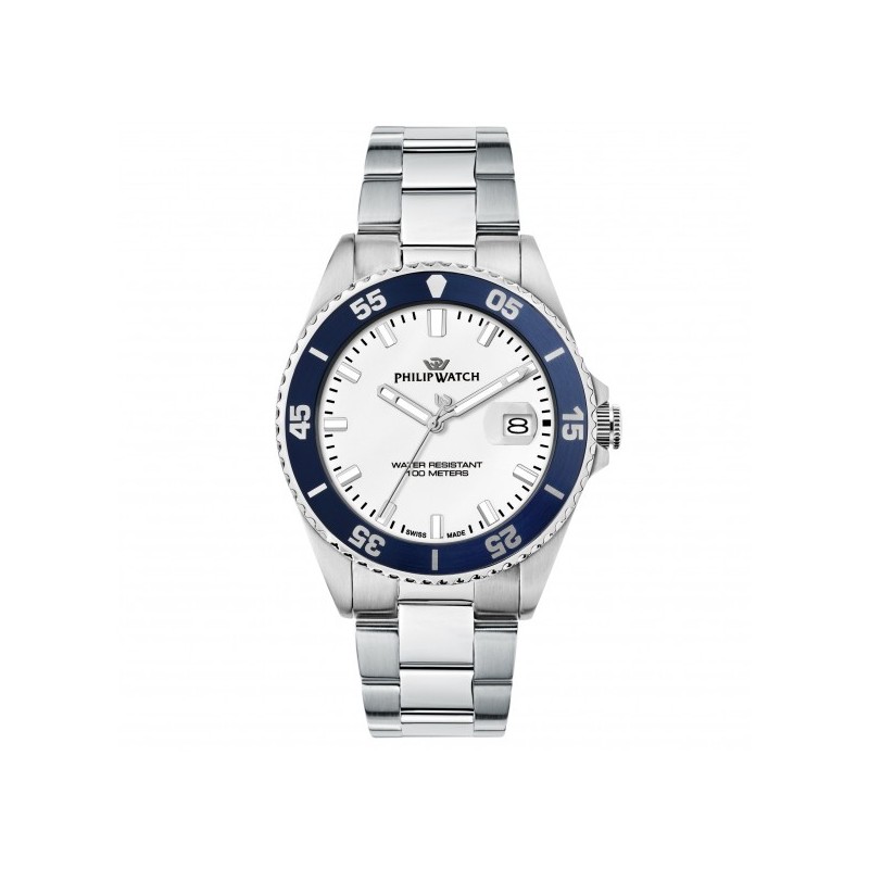 Montre homme Philip Watch de la collection Caribe Sport, dotée d'un mouvement à quartz suisse et affichant l'heure et la date. Boîtier rond en acier inoxydable argenté de 42 mm de diamètre et 11 mm d'épaisseur, fond et couronne vissés, lunette en acier émaillé bleu avec minuterie. Cadran analogique blanc avec index bâtons, guichet de date à 3 heures avec loupe, logo en haut, verre saphir. Bracelet en acier inoxydable argenté poli et satiné avec boucle déployante à fermoir de sécurité, étanche à 10 ATM.