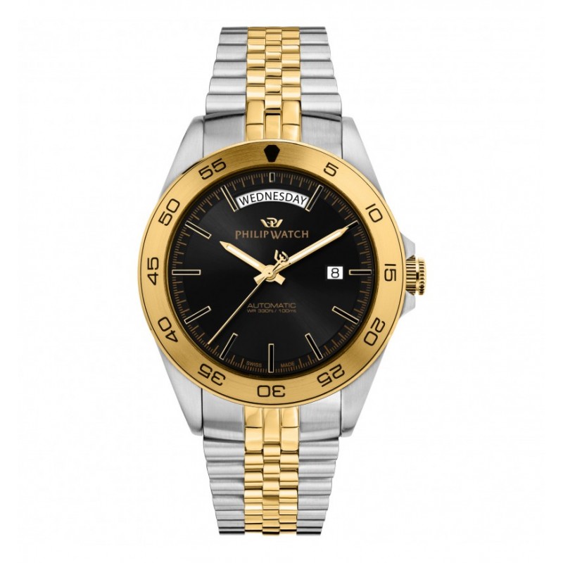 Montre homme en acier , boîtier de 41 mm , mouvement suisse, étanche à 10 ATM . Bracelet bicolore or et argent avec boucle déployante de sécurité. Verre saphir antireflet .