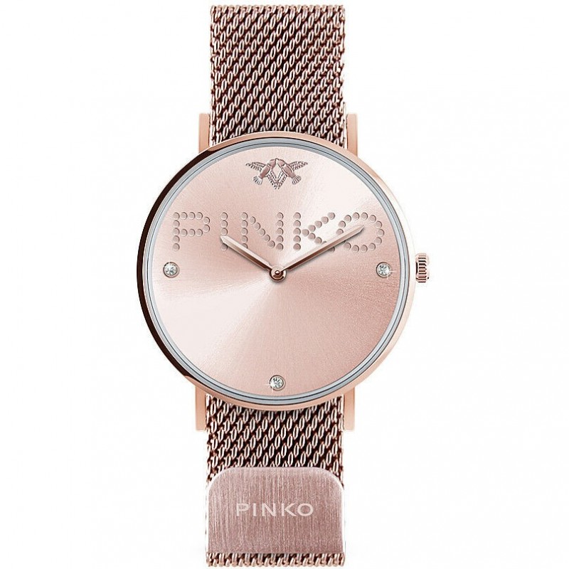 Montre-bracelet Pinko pour femme, à mouvement quartz et affichage de l'heure uniquement. Boîtier rond en acier doré rose, 32 mm de diamètre, fond clipsé en acier. Cadran analogique rose avec trois index en pierre, logo en haut, verre minéral. Bracelet en maille milanaise en acier inoxydable doré rose avec fermoir magnétique, étanche à 3 ATM : résiste aux éclaboussures, mais pas à la pression.