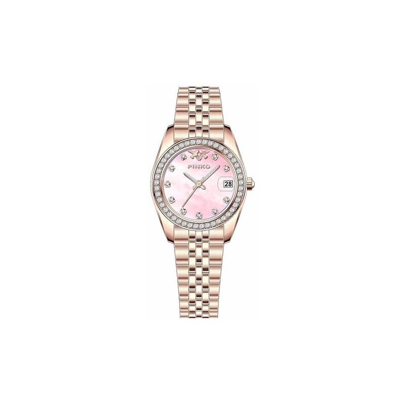 Montre-bracelet à quartz Pinko pour femme, affichant l'heure et la date. Boîtier rond en acier inoxydable doré rose de 29 mm de diamètre, fond clipsé en acier et lunette sertie de cristaux blancs. Cadran analogique rose avec index en pierres précieuses, guichet de date à 3 heures, logo en haut, verre minéral. Bracelet en acier inoxydable doré rose avec boucle déployante. Étanchéité 3 ATM : résistante aux éclaboussures, mais non étanche à la pression.