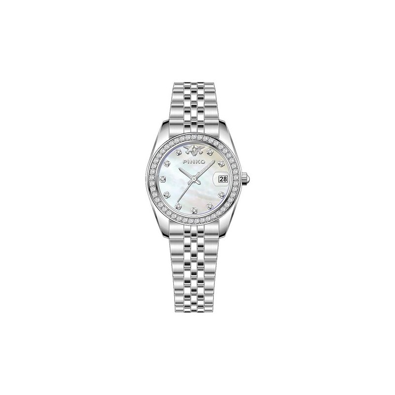 Montre-bracelet Pinko pour femme, dotée d'un mouvement à quartz myota2035 et affichant l'heure et la date. Boîtier rond en acier inoxydable argenté de 29 mm de diamètre, fond clipsé en acier, lunette sertie de cristaux Swarovski blancs. Cadran analogique en nacre avec index en pierres précieuses, logo en haut, guichet de date à 3 heures, verre minéral. Bracelet Jubilee en maille milanaise argentée avec boucle déployante. Étanchéité 3 ATM : résistante aux éclaboussures, mais non étanche à la pression.