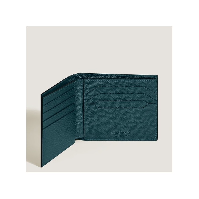 Portefeuille homme Mont Blanc de la collection Sartorial, confectionné en cuir de vachette pleine fleur Saffiano bleu Chypre. Il dispose de huit emplacements pour cartes de crédit, deux compartiments pour billets et deux poches supplémentaires pour une praticité optimale. Doublé de tissu, il mesure 115 x 5 x 95 mm.