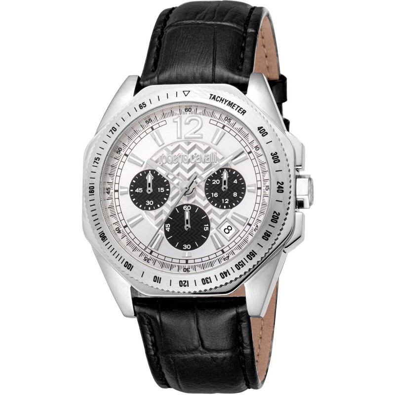 Montre-bracelet pour homme Roberto Cavalli à mouvement quartz avec fonction chronographe, date et affichage 24 heures. Boîtier rond en acier inoxydable argenté de 41 mm de diamètre et 11 mm d'épaisseur, avec lunette tachymétrique en acier argenté. Cadran analogique gris avec index bâtons et chiffre arabe à 12 heures, guichet de date entre 4 et 5 heures, logo en haut, verre minéral. Bracelet en cuir noir avec boucle ardillon, étanche à 10 ATM.