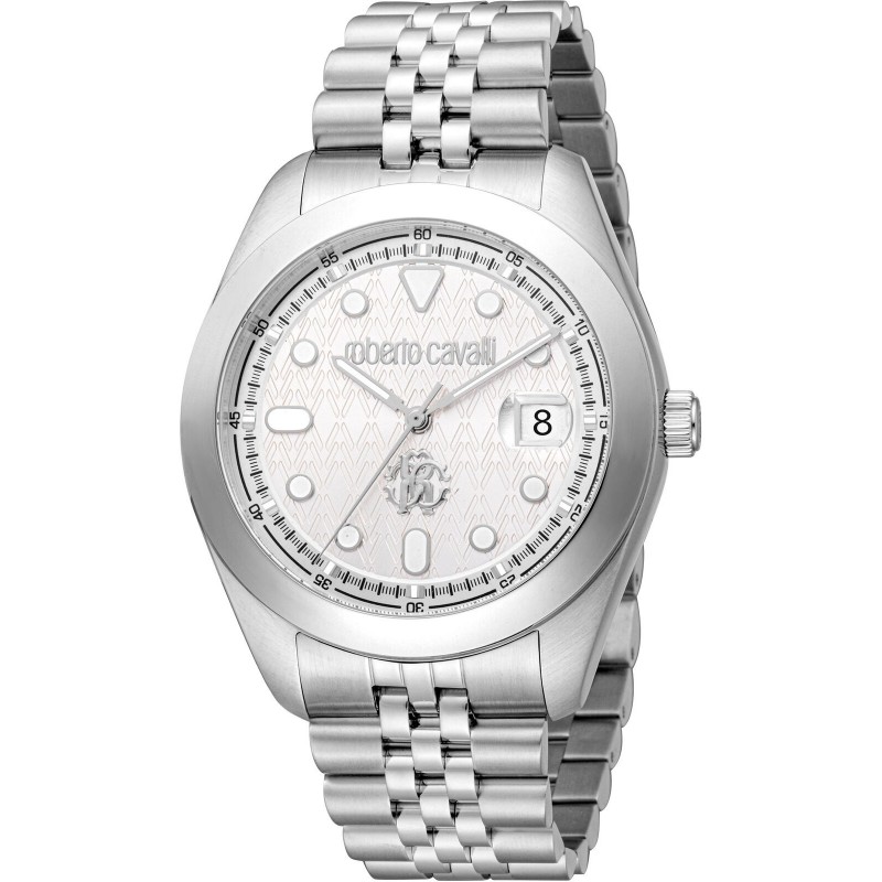 Montre-bracelet pour homme Roberto Cavali à mouvement quartz, affichage de l'heure et de la date. Boîtier rond en acier inoxydable argenté, 41 mm de diamètre et 10 mm d'épaisseur. Cadran analogique argenté avec index géométriques, guichet de date à 3 heures, logo sur le dessus, verre minéral. Bracelet Jubilee en maille milanaise argentée avec boucle déployante à bouton-poussoir, étanche à 10 ATM.