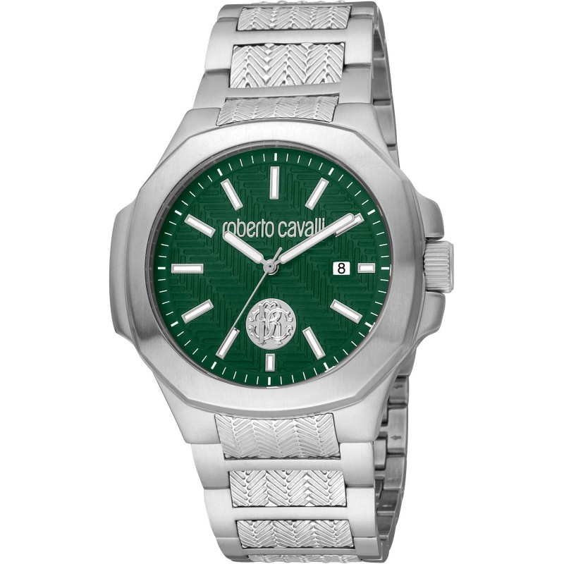 Montre-bracelet pour homme Roberto Cavalli à mouvement quartz, affichage de l'heure et de la date. Boîtier rond en acier inoxydable argenté de 41 mm de diamètre et 11 mm d'épaisseur, avec lunette en acier argenté. Cadran analogique vert avec index bâtons, guichet de date à 3 heures, logo en haut, verre minéral. Bracelet en acier inoxydable argenté avec boucle déployante papillon à bouton-poussoir, étanche à 10 ATM.