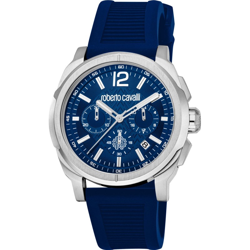Montre-bracelet pour homme Roberto Cavalli à mouvement quartz avec fonction chronographe et date. Boîtier rond en acier inoxydable argenté de 43 mm de diamètre et 11 mm d'épaisseur, avec lunette en acier argenté. Cadran analogique bleu avec index bâtons et chiffre arabe à 12 heures, guichet de date entre 4 et 5 heures, logo en haut, verre minéral. Bracelet en silicone bleu avec boucle ardillon, étanche à 10 ATM.