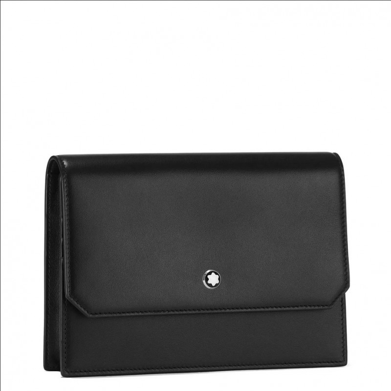 Sac à main Mont Blanc pour femme, issu de la collection Meisterstück, confectionné en cuir de veau pleine fleur tanné au chrome noir brillant, teint dans la masse. Ce sac est doté d'une doublure en tissu recyclé durable, d'un emblème annulaire plaqué palladium, de deux anneaux pour la bandoulière et d'une fermeture à rabat avec deux boutons-pression. Dimensions : 175 x 30 x 130 mm.