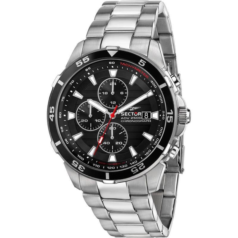 Montre chronographe Sector pour hommes de la collection adv2500. Horloge avec boîtier en métal poli et satiné de la taille de 43 mm avec verre minéral. Bracelet en métal de couleur argentée avec fermeture à boucle de plongée avec verrouillage de sécurité. La résistance à l'eau est de 10 Atm.