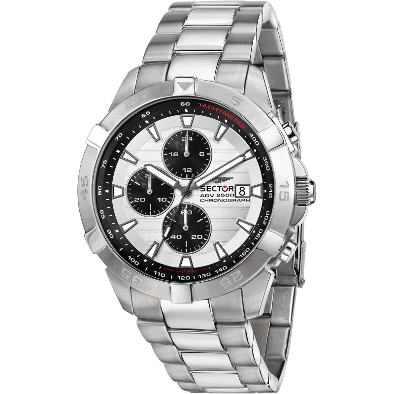 Montre chronographe Sector pour hommes de la collection adv2500. Horloge avec boîtier en métal poli et satiné de la taille de 43 mm avec verre minéral. Bracelet en métal de couleur argentée avec fermeture à boucle de plongée avec verrouillage de sécurité. La résistance à l'eau est de 10 Atm.